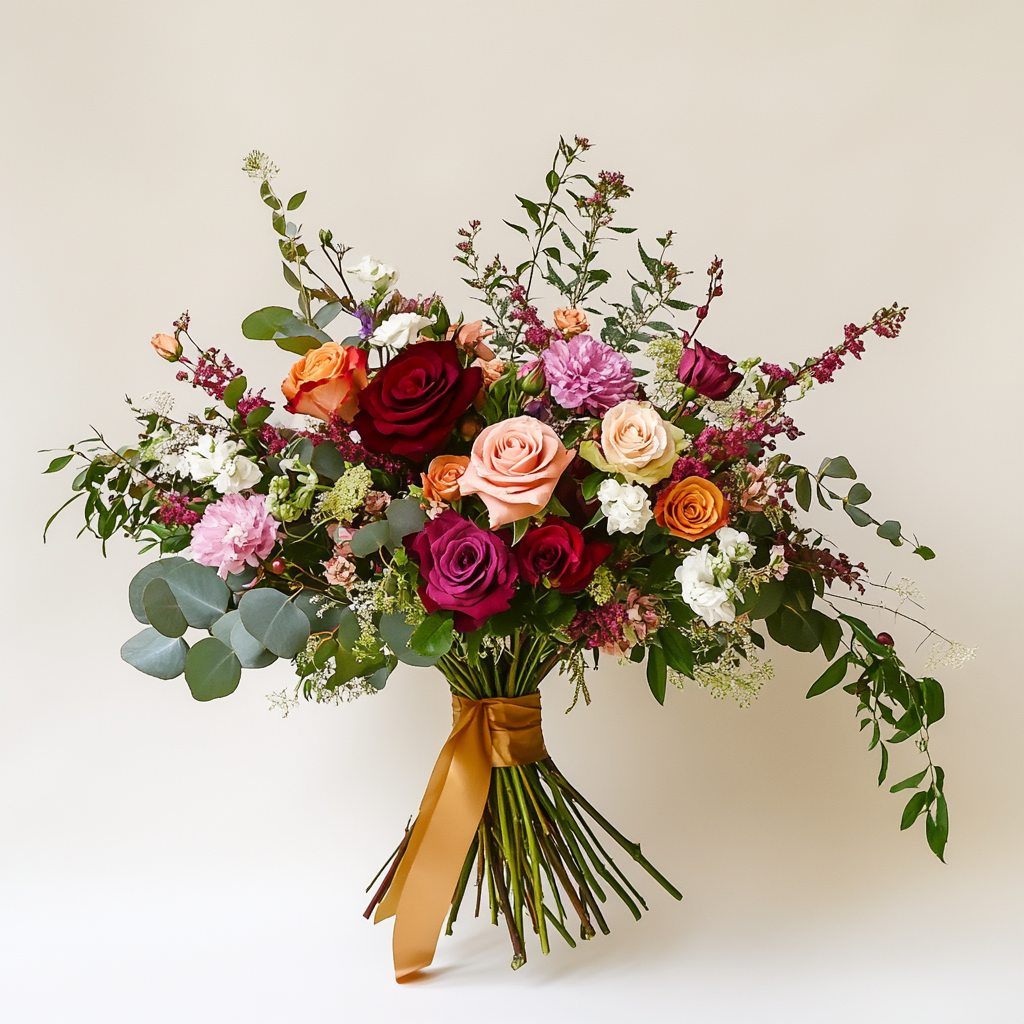 Whoa, dive into these deep reds and oranges with roses stealing the show, blended with purples and whites for that moody, passionate edge. Eucalyptus adds a fresh twist, tied up in gold for extra elegance. This one’s your go-to for anniversaries or apologies—evokes that fiery romance vibe, making hearts skip a beat. Imagine handing it over and watching their eyes light up… pure magic for those special ‘I love you’ moments.