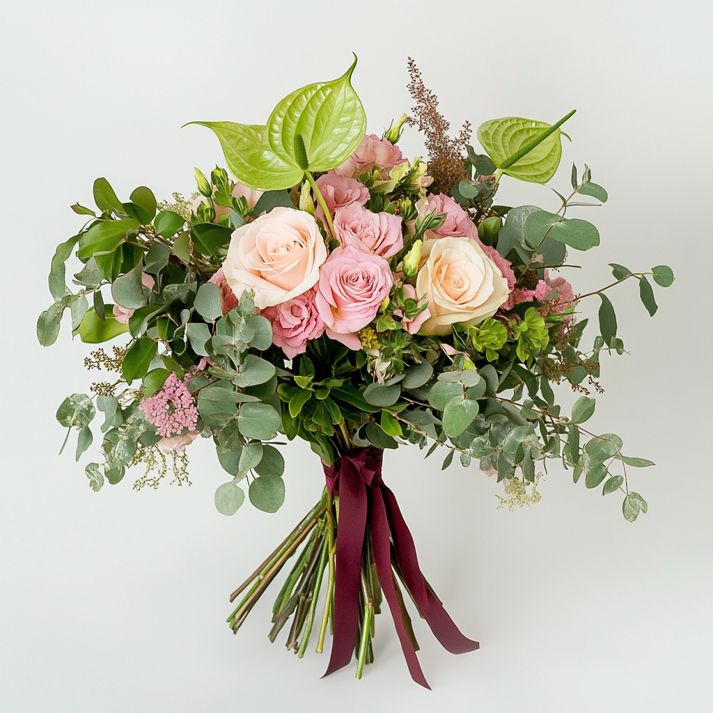 Picture this: soft pink and peach roses nestled with those cool green anthuriums, all wrapped in silvery eucalyptus that smells like a spa day. It’s got this gentle, dreamy feel—like a hug from spring itself. Ideal for baby showers or just because gifts, it’ll brighten up anyone’s space and make them feel all warm and fuzzy inside… yeah, the kind of bouquet that says ‘thinking of you’ without trying too hard.
